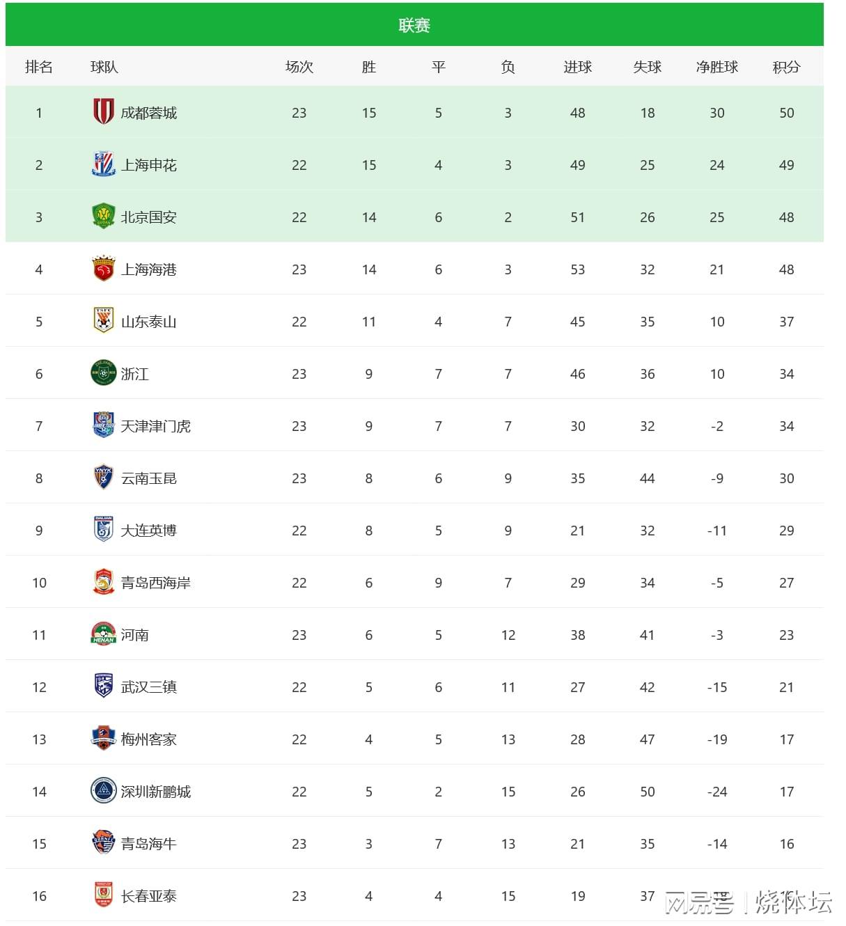 成都蓉城主场全取3分,斩获联赛2连胜,总积分提升到50分。成都蓉城排名升至第一,总积分反超上海海港,而上海申花、北京国安目前少赛1场。上海海港暂时下滑到第四,这场关键比赛没能拿到积分,争冠变得有些被动。