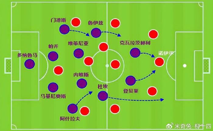 登贝莱先发,就能先手主导控球,释放出两翼速度优势,打出犀利的攻防转换。登贝莱替补,巴黎先手是利用巴尔科拉和克瓦拉茨赫利亚的速度与反击接球时的转身和起速能力,不断消耗对手。